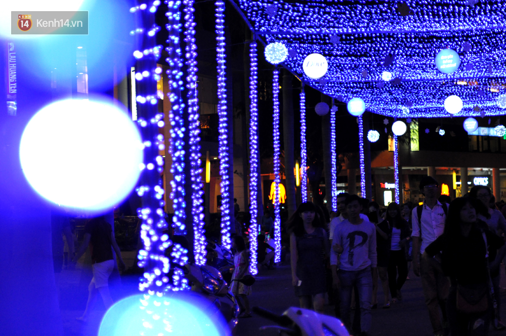 Hệ thống đèn màu xanh được trang trí tại cổng vào, cây thông Nole và xung quanh con đường từ một trung tâm thương mại đến Hồ Bán Nguyệt khiến nhiều người rất thích thú mỗi khi đến đây thả bộ. Ngoài ra, một số bạn trẻ cũng không quên lưu lại cho mình những bức ảnh đẹp với con đường rực rỡ và lãng mạn này.