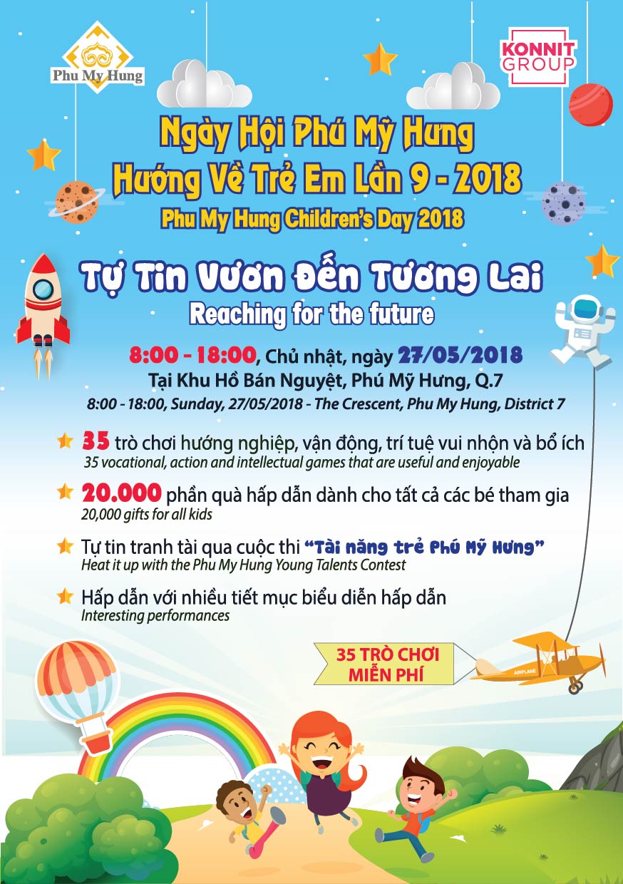 Với chủ đề “Tự tin vươn đến tương lai”, Công ty Phú Mỹ Hưng mong muốn đồng hành cùng các bậc phụ huynh trong việc tạo điều kiện và môi trường thuận lợi cho các em tự tin học hỏi, trau dồi kỹ năng qua các trò chơi, hoạt động hữu ích tại Ngày hội với hơn 20.000 phần quà hấp dẫn, miễn phí dành cho tất cả các bé.