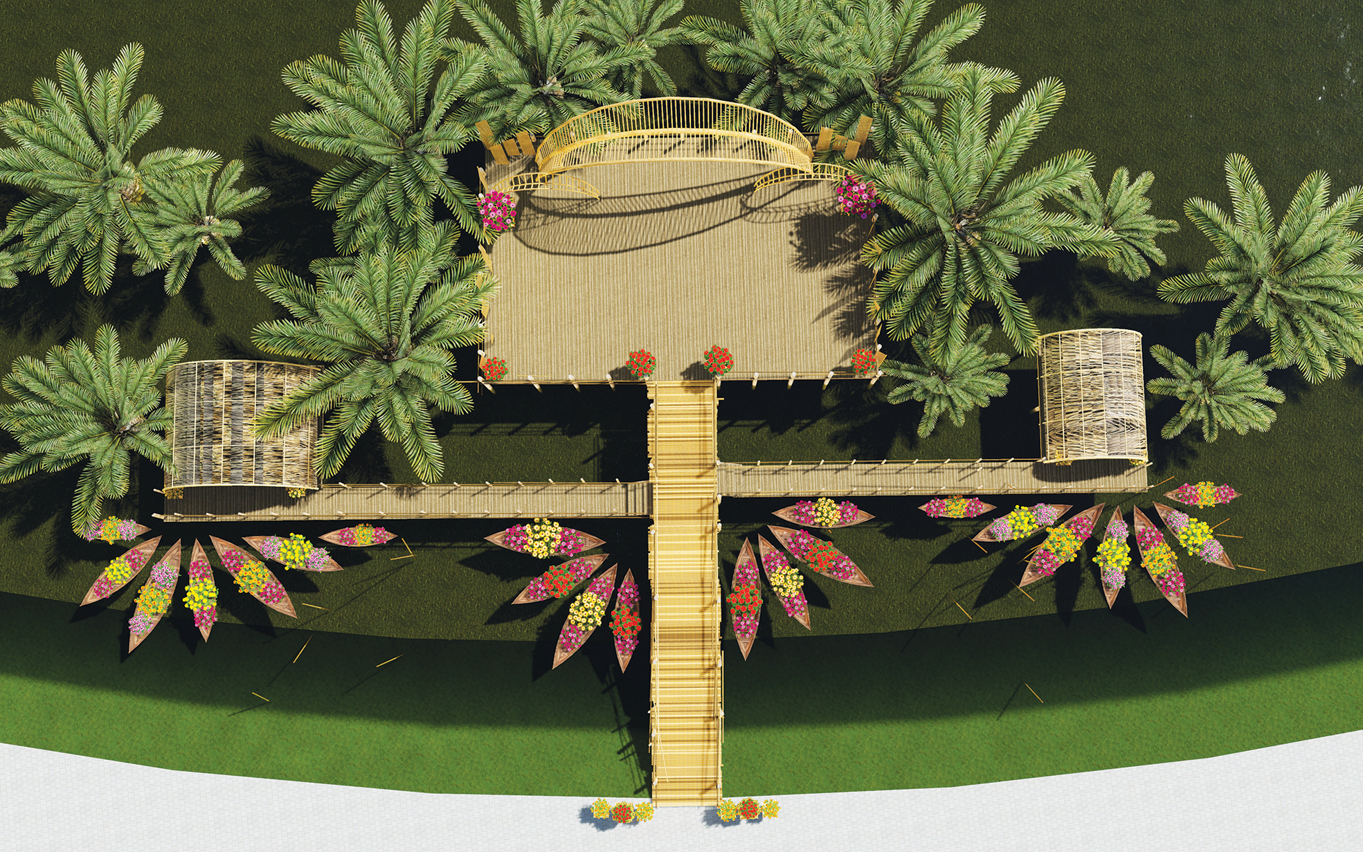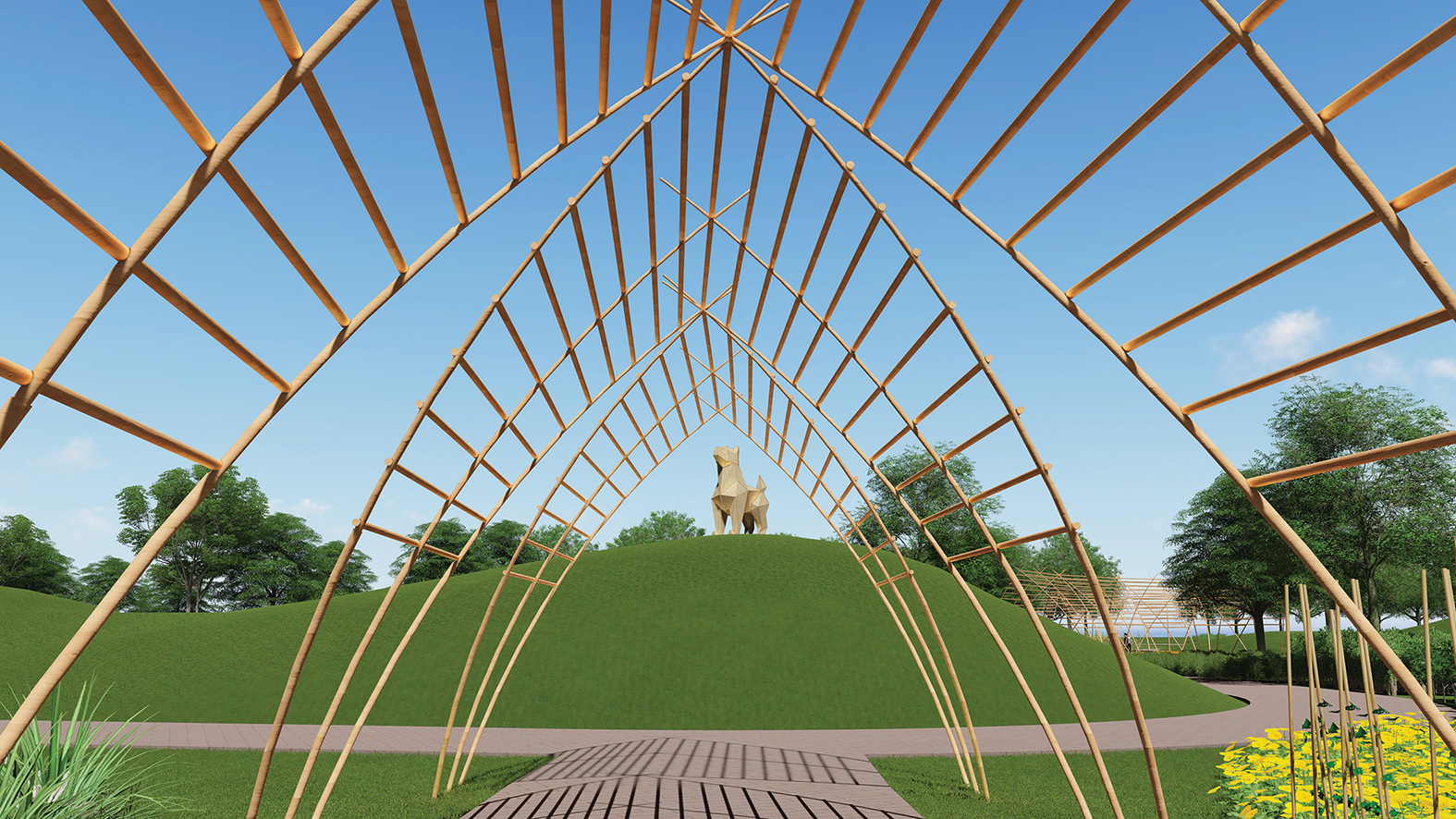 Spring Garden with mascot dog located on the high hill, in front is a stylized creepers from the image of coconut leaves.