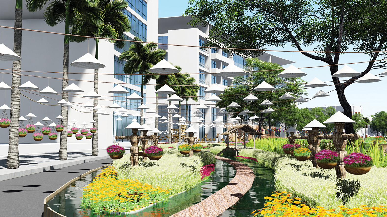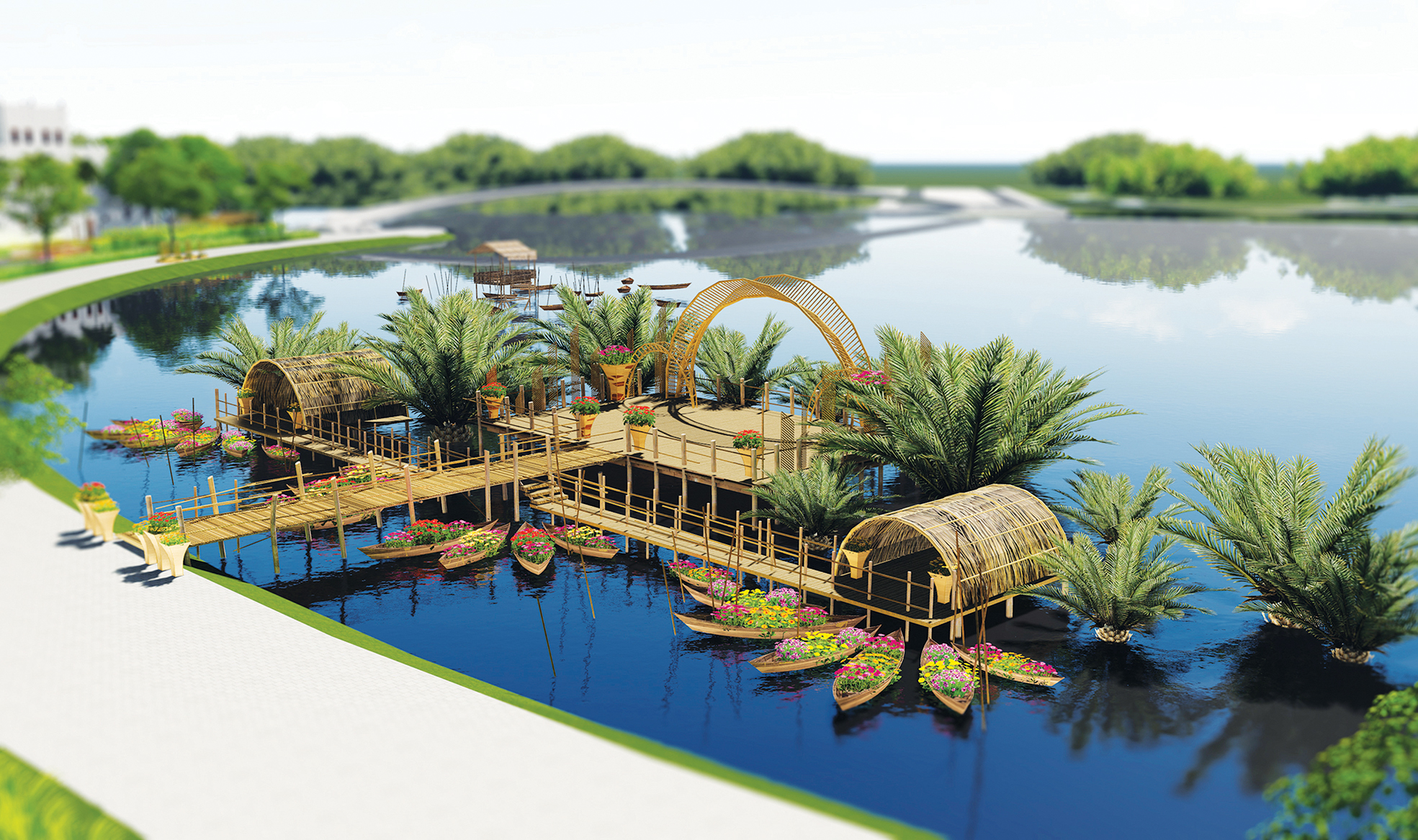 Taking the water as a creative point is the motto of the Spring Flowers Festival inspired by Nha Be waterfront and the South, so you will encounter many creativities from WATER in this Spring Flowers Festival. It may be a RAIN GARDEN, a beautiful, poetic and romantic work of creativity, when the water is elevated to create a light spring rain and visitors can take an umbrella walking in the rain to enjoy the spring feeling and take many new photos. Then there will be RAIN TREES, a garden which is designed vertically with rising water, or a system of water troughs with bamboo tubes connecting like a network that simulates the way water is directed by mountainous people…  After those surprising things with water, you will come to the Spring Road as a continuum of features of Vietnam’s water economy: water rice paddies, lotus pond, shrimp pond, fish pond, tram mangroves …