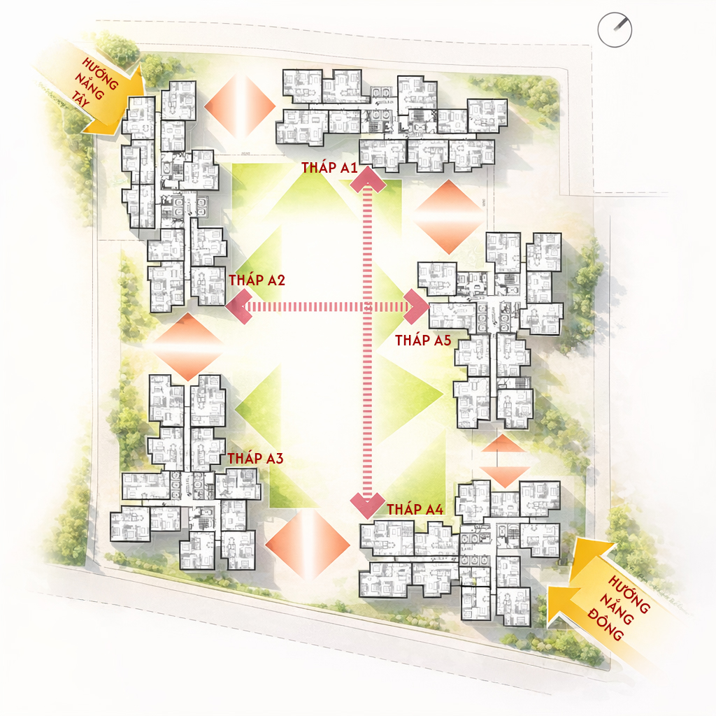 Các tòa tháp được xoay trục và bố trí thông minh nhằm tối ưu ánh sáng tự nhiên và thông gió, hạn chế tác động trực tiếp của nắng gắt lên căn hộ, từ đó nâng cao sự thoải mái và tiết kiệm năng lượng trong sinh hoạt hằng ngày. XEM CHI TIẾT