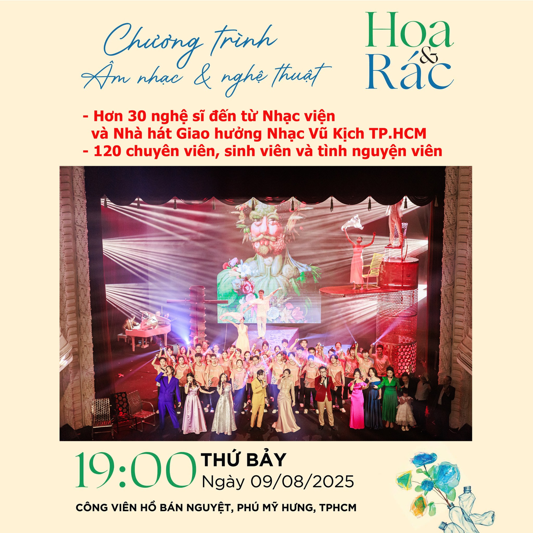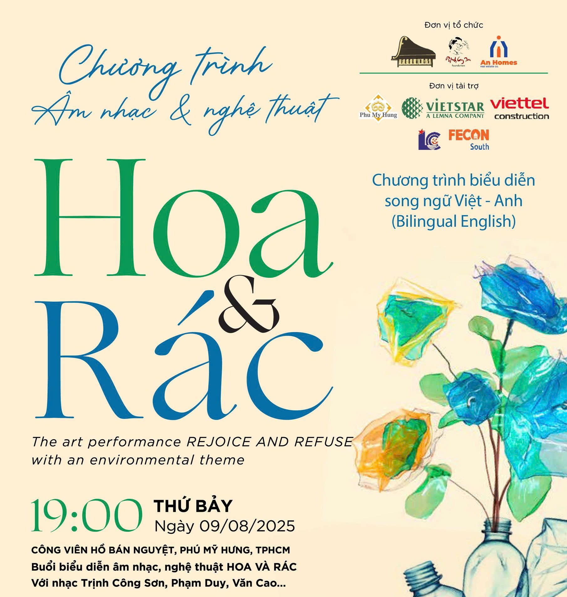 Đêm nhạc “Hoa và Rác”, một chương trình nghệ thuật âm nhạc độc đáo, lấy câu chuyện môi trường làm chủ đề trình diễn, sẽ diễn ra vào tối 9/8/2025 tại Công viên Hồ Bán Nguyệt, đô thị Phú Mỹ Hưng, phường Tân Hưng, TP.HCM. Chương trình mở cửa miễn phí dành cho khán giả.
