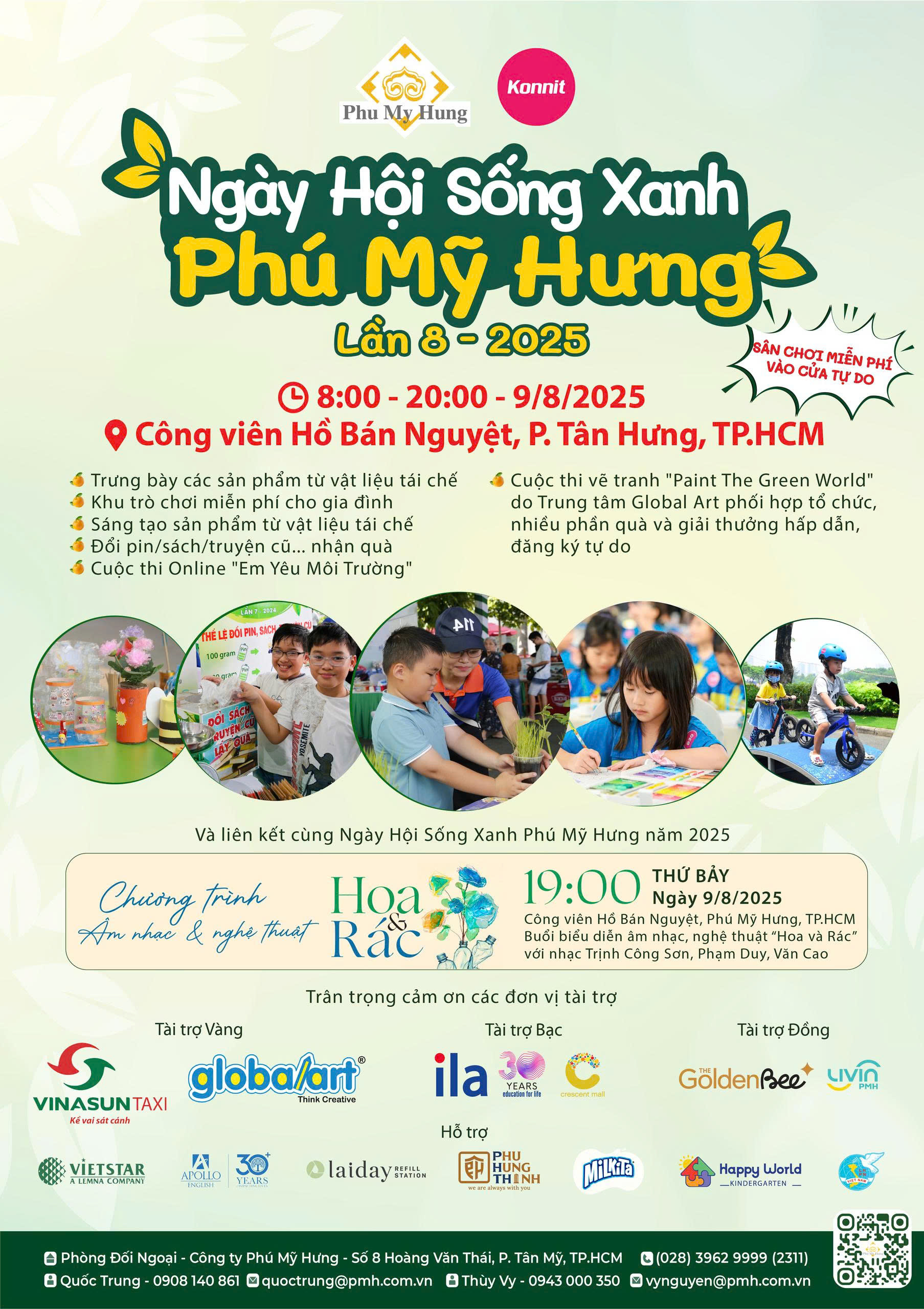 Đặc biệt, ở lần trình diễn này, Đêm nhạc “Hoa và Rác” còn có sự liên kết về chủ đề và không gian tổ chức với Ngày hội sống xanh Phú Mỹ Hưng lần 8, một sự kiện cộng đồng thường niên của Công ty Phú Mỹ Hưng. Với chủ đề Sống Xanh – Sống Khỏe, ngày hội sẽ diễn ra từ 8:00 – 20:00 ngày 9/8/2025 tại công viên Hồ Bán Nguyệt (phường Tân Hưng, TP.HCM) gồm các hoạt động như: trưng bày các vật dụng được làm từ vật liệu tái chế, mô hình cây xanh, hướng dẫn trồng và chăm sóc cây xanh tại nhà; đổi pin, thiết bị điện tử, đồ dùng giấy và nhựa, đồ chơi, truyện sách, dụng cụ học tập… đã qua sử dụng để nhận quà. Với mong muốn lan tỏa các thông điệp về môi trường, Ngày hội sống xanh Phú Mỹ Hưng lần 8 còn có Cuộc thi “Em yêu môi trường” Online, sáng tạo sản phẩm từ vật liệu tái chế; Cuộc thi vẽ về môi trường và thế giới xanh “Paint The Green World”… Thông tin chi tiết về cuộc thi, vui lòng tham khảo tại Fanpage “Phú Mỹ Hưng Ngày Nay”.