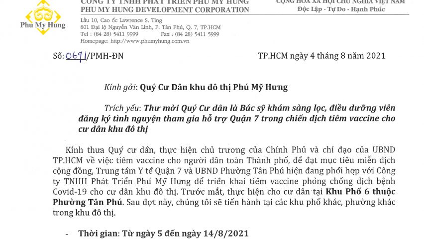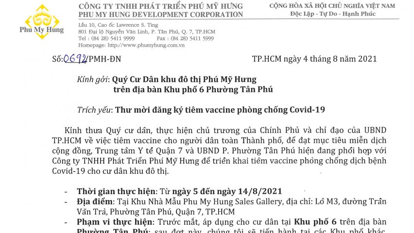 Thực hiện chủ trương của Chính Phủ và chỉ đạo của UBND TP.HCM về việc tiêm vaccine cho người dân toàn Thành phố, để đạt mục tiêu miễn dịch cộng đồng, Trung tâm Y tế Quận 7 và UBND P. Tân Phú hiện đang phối hợp với Công ty TNHH Phát triển Phú Mỹ Hưng […]